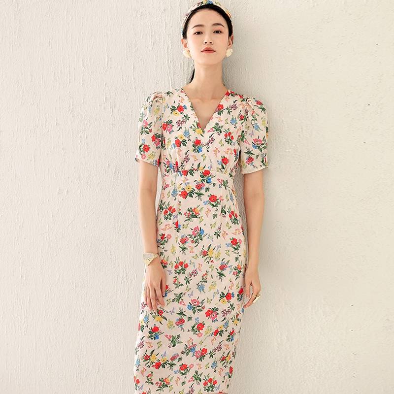 2018新款夏雪纺碎花连衣裙女中长款V领显瘦高腰泡泡袖小个子长裙