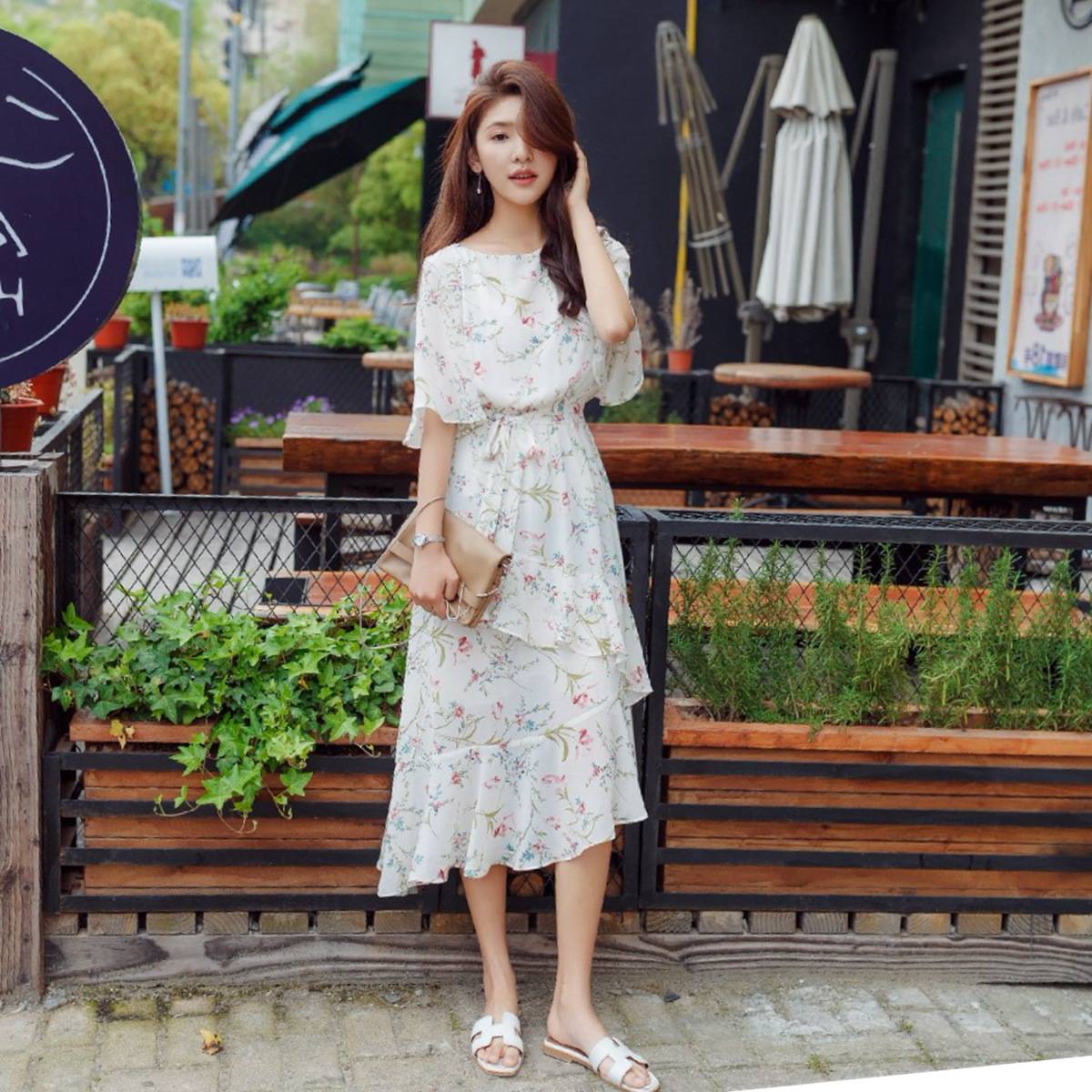 实拍度假风chic碎花雪纺连衣裙18新款夏季甜美荷叶边收腰印花裙子