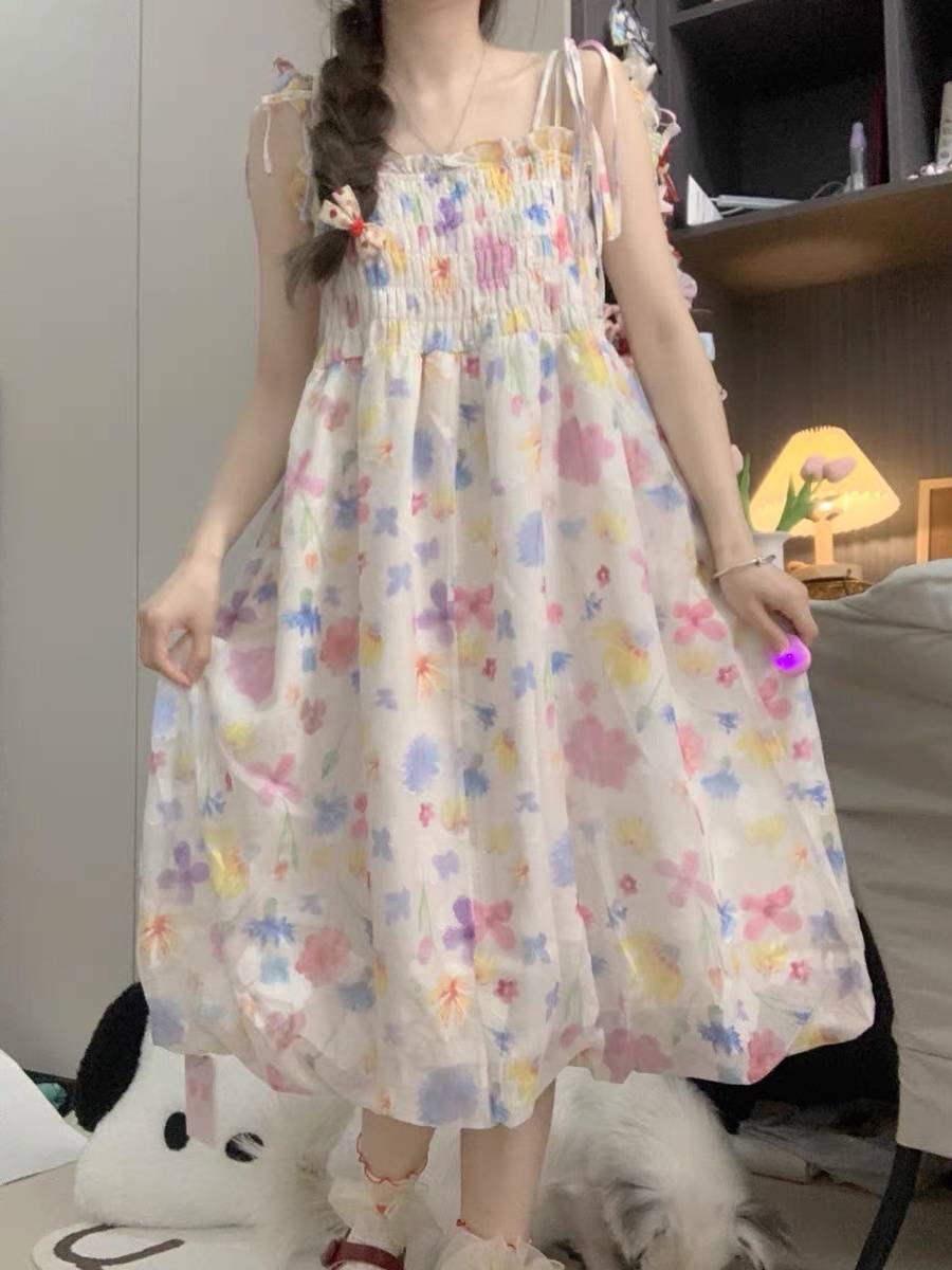 复古温柔风碎花吊带连衣裙女夏季小个子甜美度假风显瘦花苞裙长裙