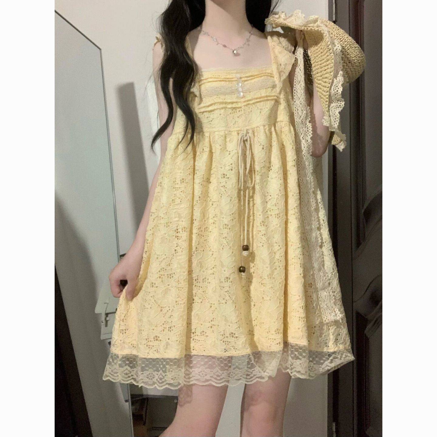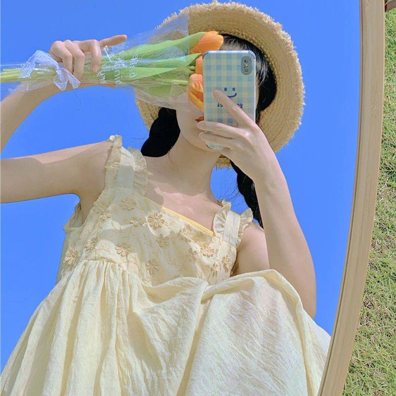 小个子清新小黄裙新款木耳边减龄甜美吊带连衣裙2023年春夏季日系