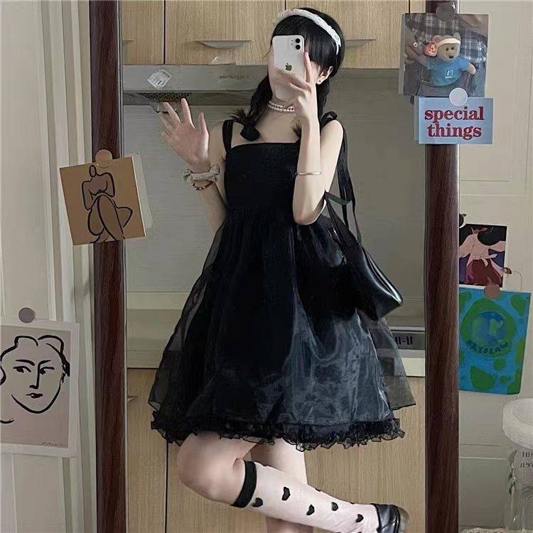 法式暗黑系矮小个子网纱蓬蓬吊带连衣裙子女学生森系收腰显瘦夏天