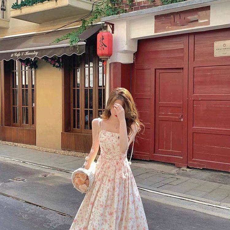有内衬 法式初恋风粉色碎花吊带连衣裙女春夏新款设计感桔梗长裙