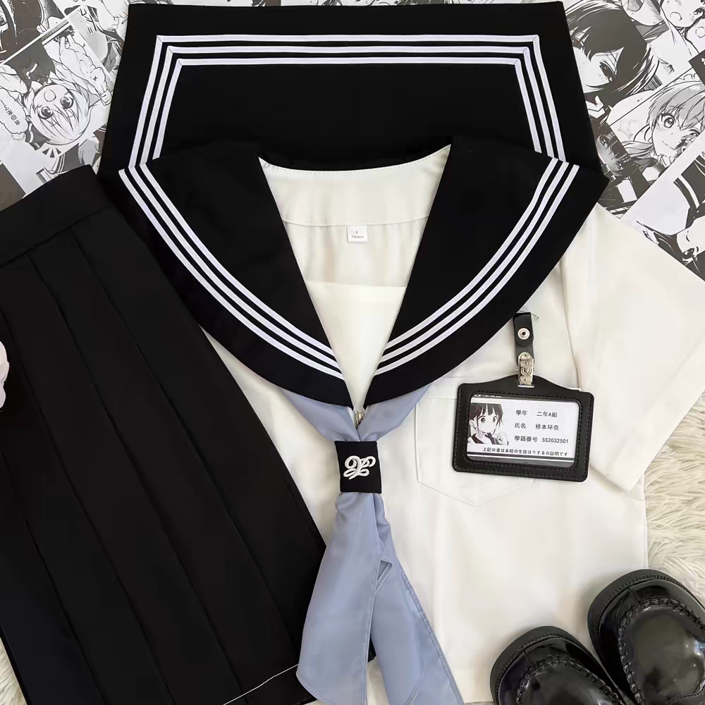 [神北JK]原创水手服正统jk制服套装基础款黑身白三本夏服百褶裙