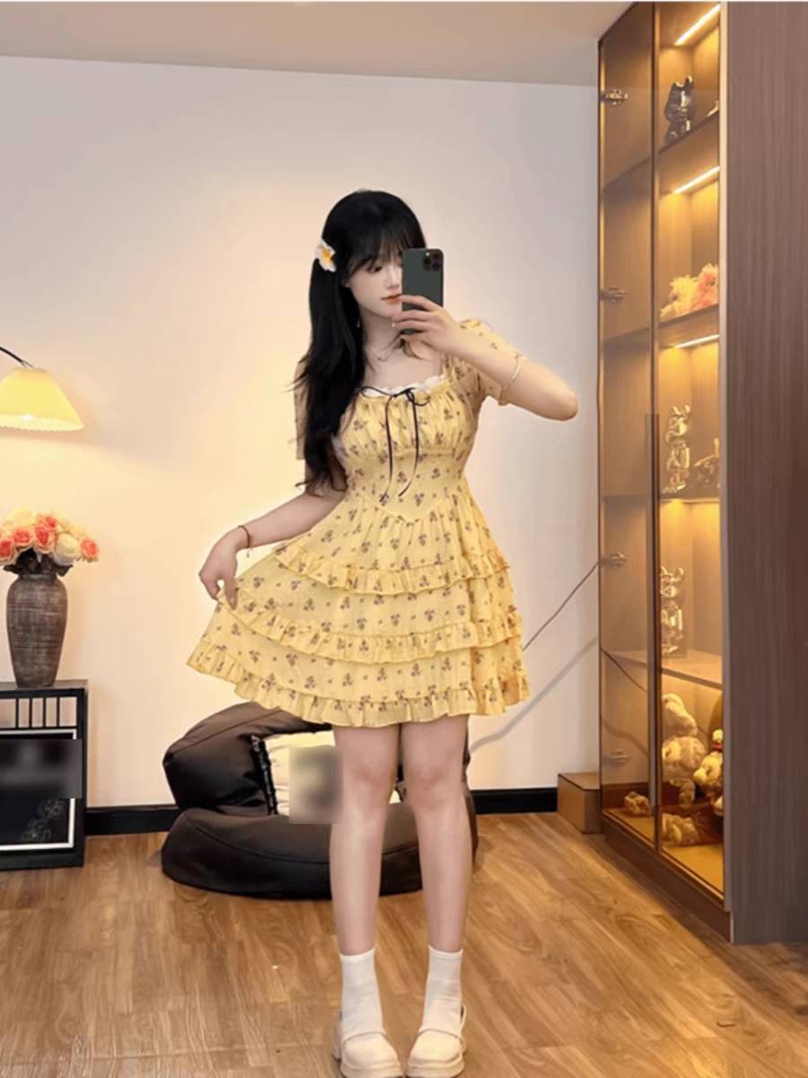 大码法式甜美短袖连衣裙女夏季收腰蛋糕短裙微胖MM荷叶边公主裙子
