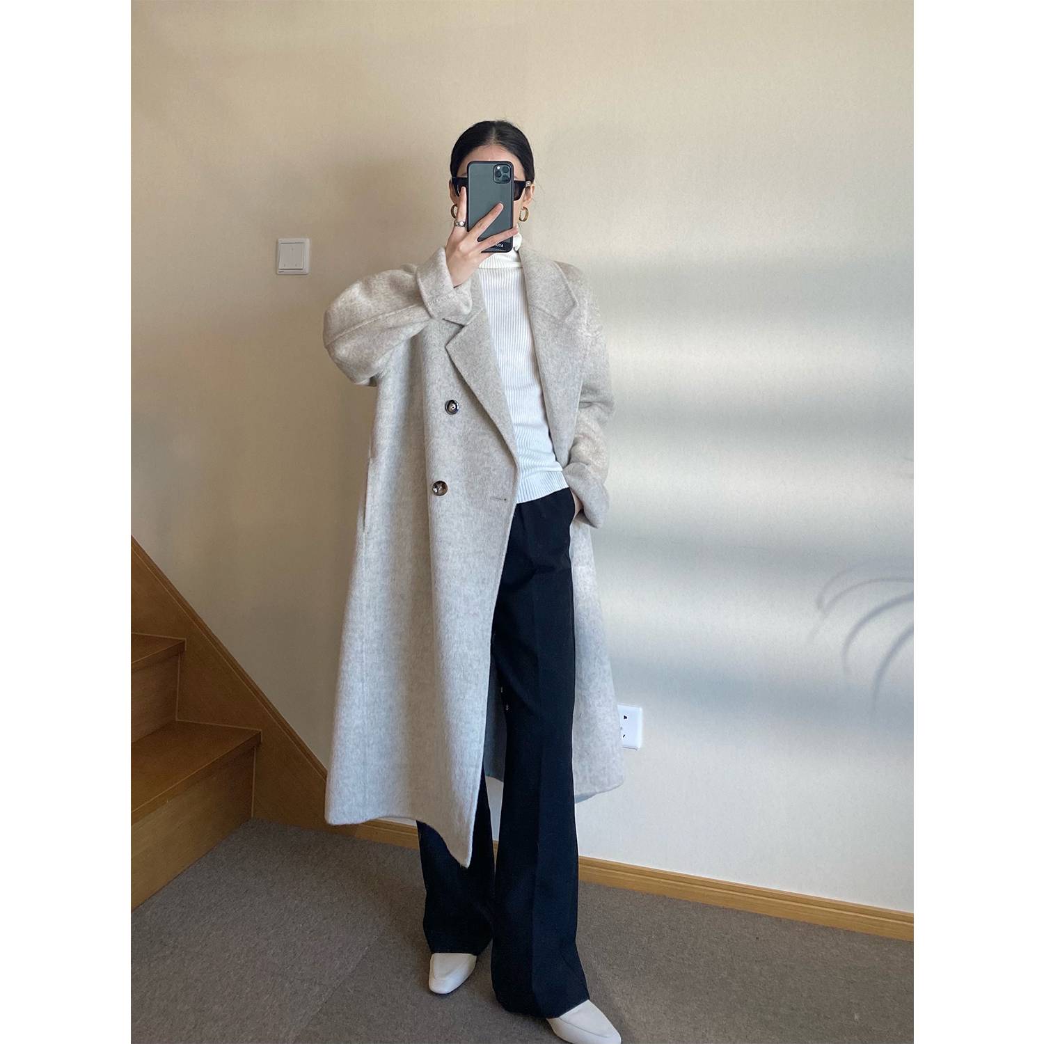 2020年秋冬新款韩版双面呢手缝长款羊毛大衣单排扣中长款毛呢外套