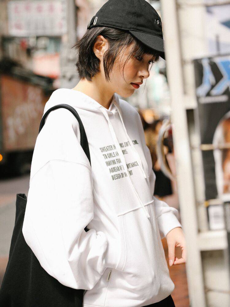 复古连帽长袖印花宽松休闲潮流白色卫衣学生女