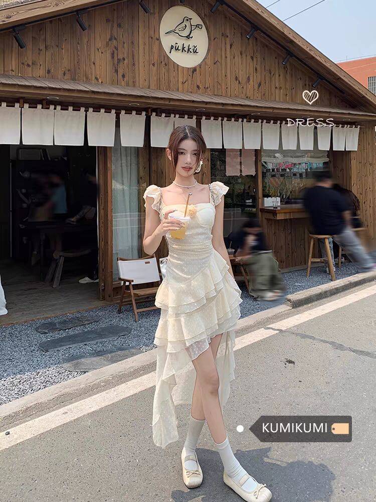 法式白色不规则吊带裙连衣裙女夏季海边收腰A字裙长裙子