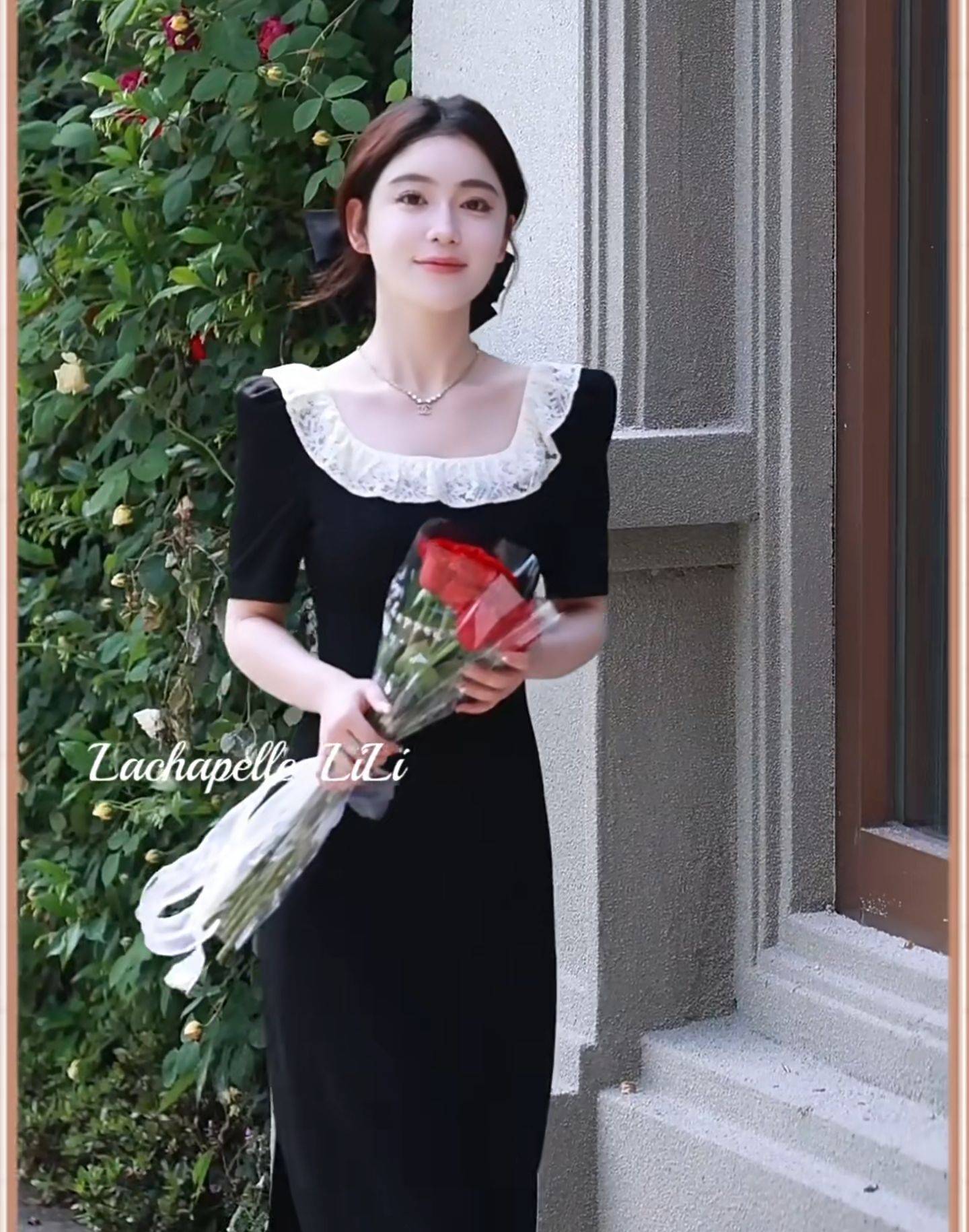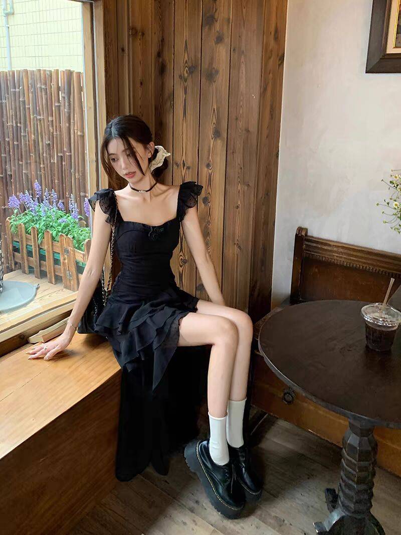 黑色赫本风短袖收腰连衣裙2024夏季新款初春方领高级长裙裙子女装