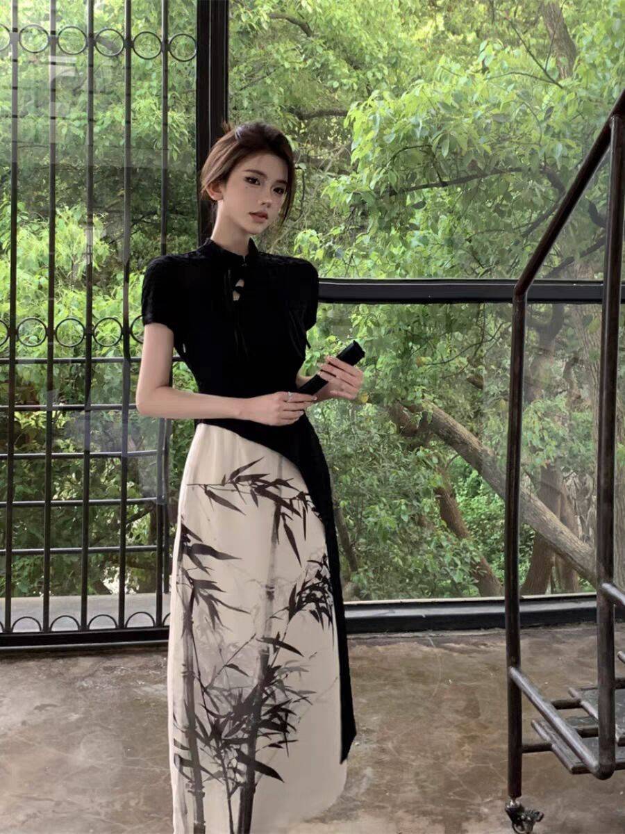 新中式国风短袖连衣裙女改良旗袍裙子春季新款高级感收腰气质长裙