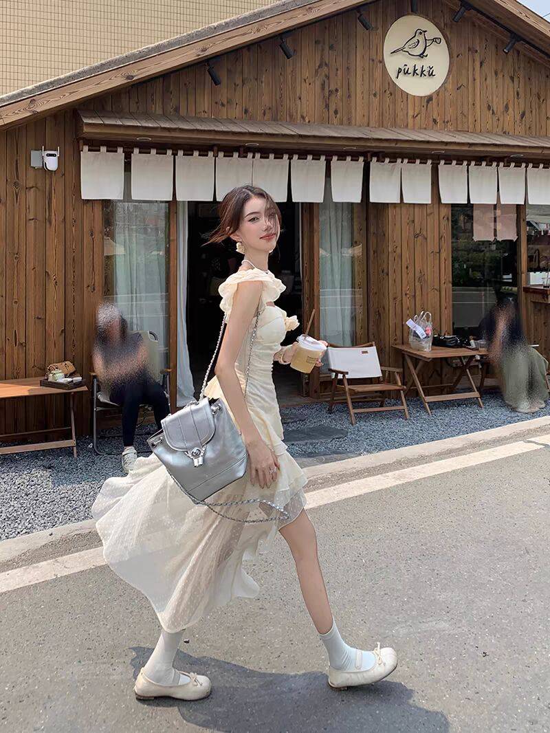 法式白色不规则吊带裙连衣裙女夏季海边收腰A字裙长裙