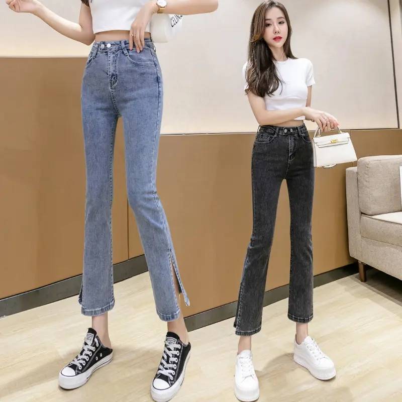 2020春夏创意款批发喇叭牛仔裤女宽松休闲高腰显瘦毛边长裤