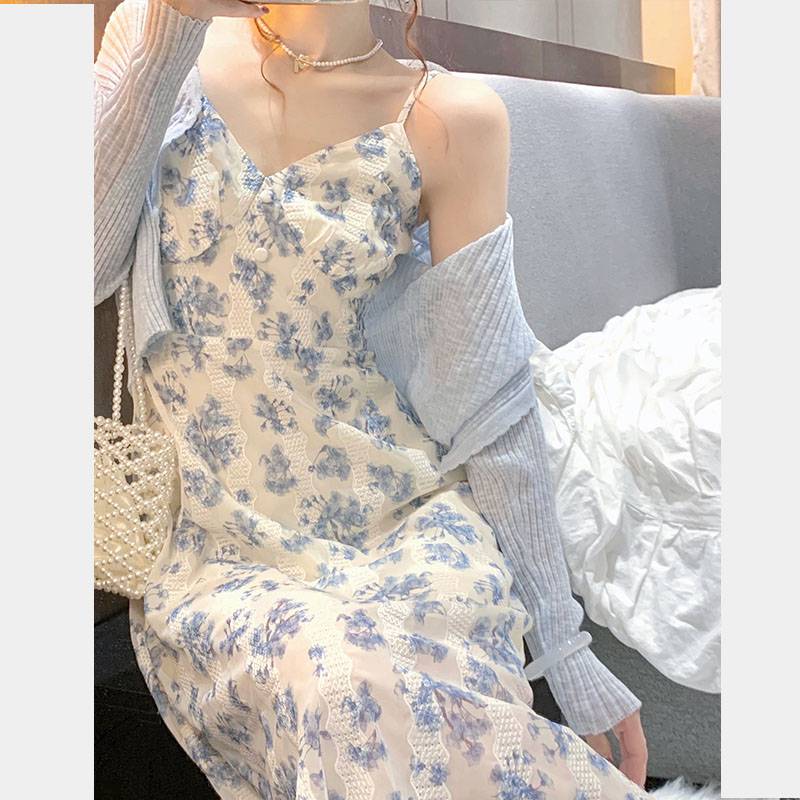 春秋法式温柔风别致艺术雪纺碎花吊带连衣裙子女两件套设计感小众