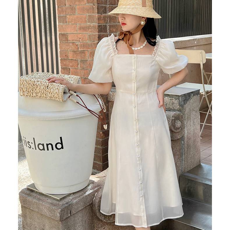 十三行纯色高级感复古雪纺连衣裙女方领泡泡袖中长款裙子