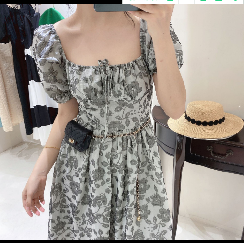 法式方领泡泡袖黑色碎花连衣裙夏季2022新款气质收腰裙子