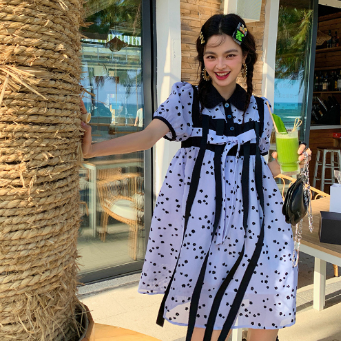 蓝色蝴蝶花碎花连衣裙女双层娃娃领叠加撞色高腰显瘦裙子夏季