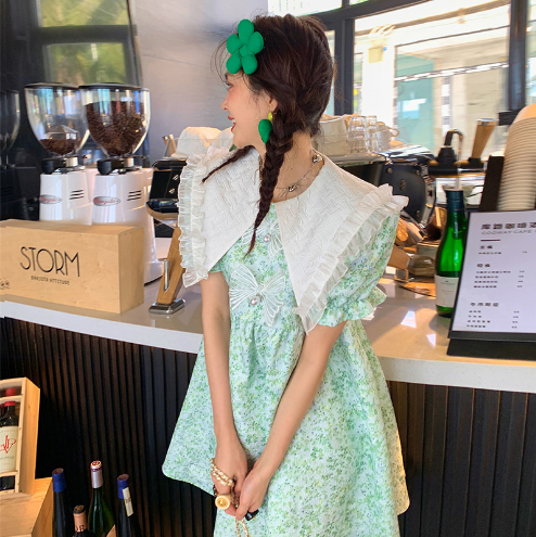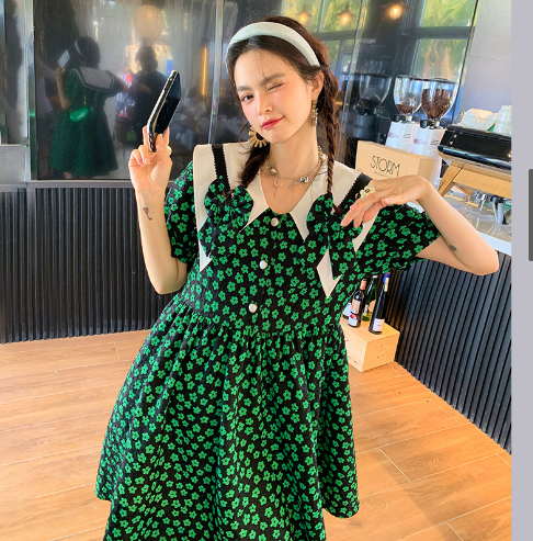 绿色清纯碎花连衣裙夏季2022杭州女装可爱辣妹短袖娃娃领裙子