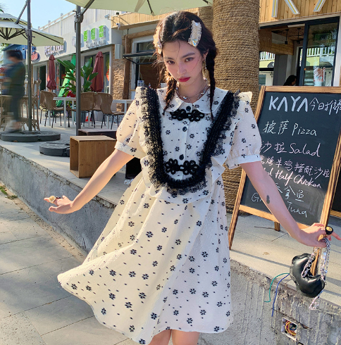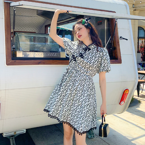 夏季新款碎花连衣裙女旗袍风泡泡袖蕾丝裙子减龄裙子洋气显洋气