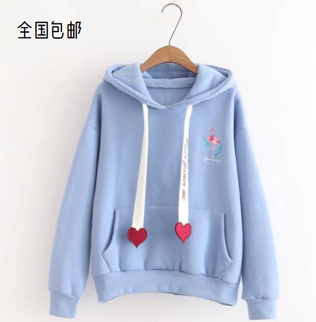 秋冬季韩版卫衣女宽松加厚连帽绒衫上衣飘带刺绣大码长袖
