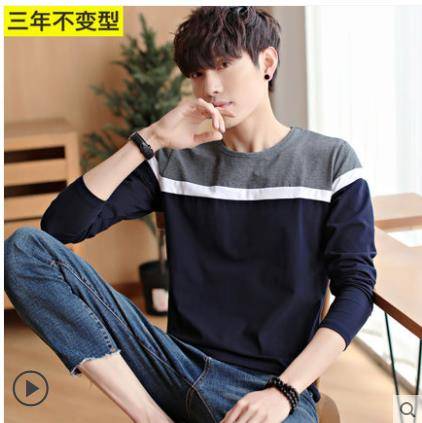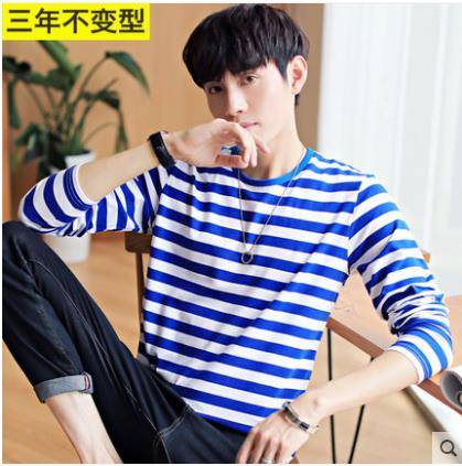 春秋长袖t恤男圆领韩版潮流条纹秋衣蓝色内搭外穿海魂衫纯棉打底