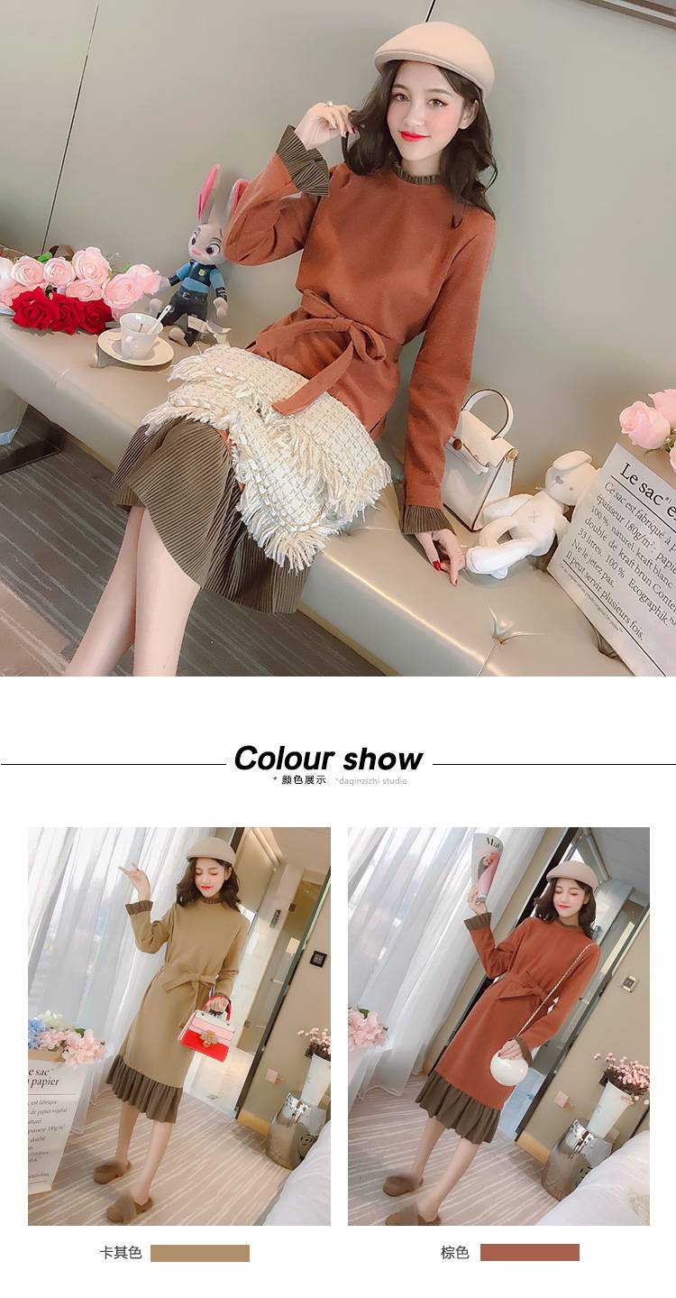 2018秋季新款长袖毛呢连衣裙女拼接百褶荷叶边百搭中长款打底裙子 99.00 已售:0件