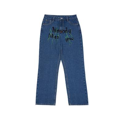 秋冬女装穿搭潮流字母撞色刺绣直筒修身洗水牛仔裤女