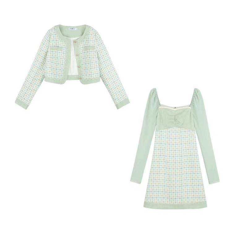 小香风短外套粗花呢针织A字裙绿色连衣裙女秋季气质名媛两件套装