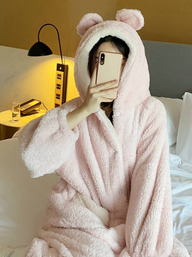 小熊睡袍加厚保暖居家服毛绒可爱珊瑚绒女秋冬季宽松连帽睡衣