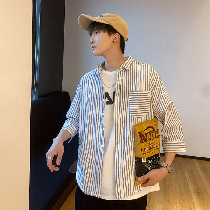 条纹衬衫男士七分袖衬衣韩版潮流帅气休闲情侣上衣服秋季长袖外套 78.00 已售:0件
