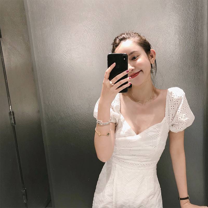 张大奕绣花蕾丝方领连衣裙女2018新款夏收腰显瘦中长款泡泡袖裙子