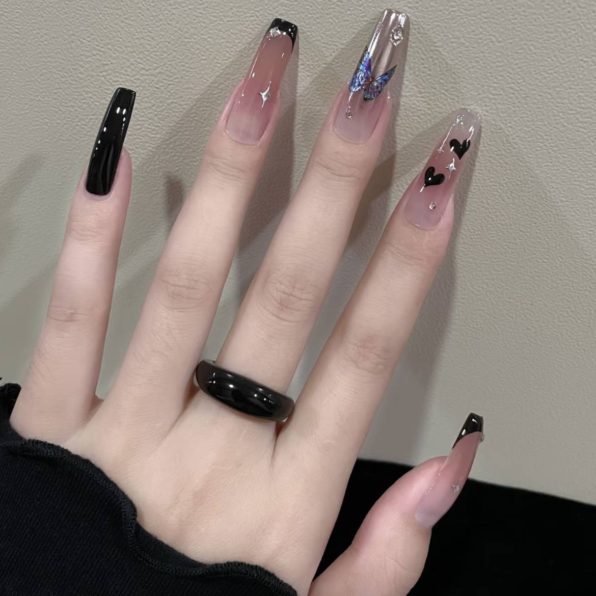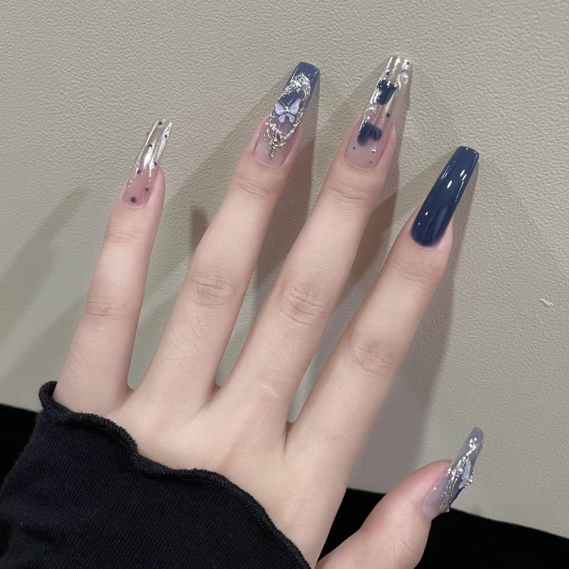 小乔家新连穿戴甲 look♡♩韩系ins风的藏蓝爱心蝴蝶美甲