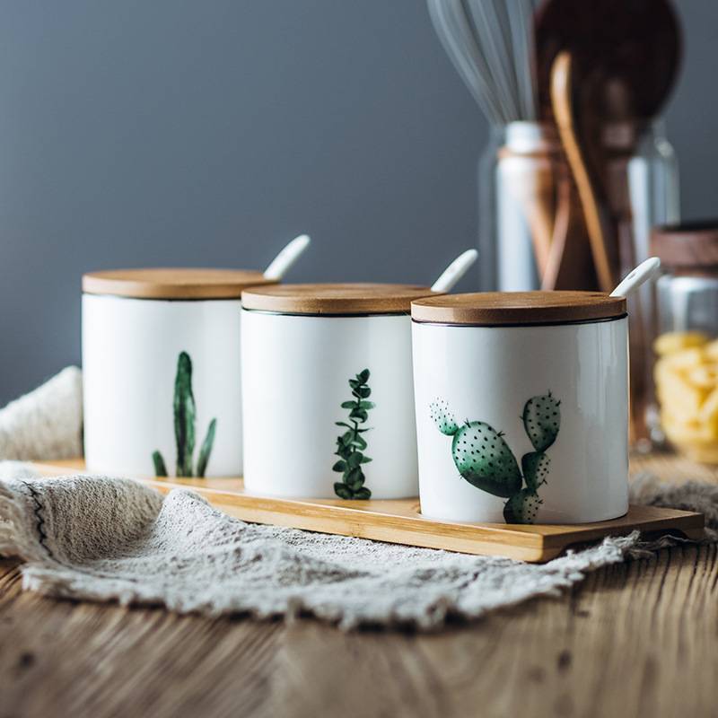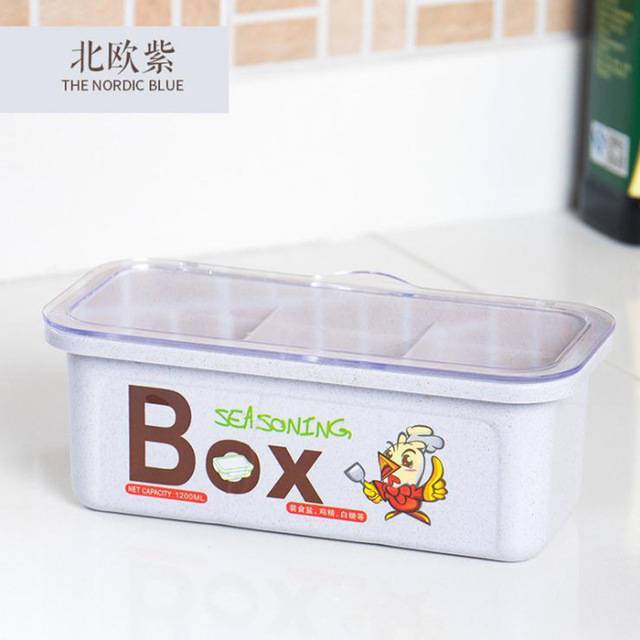 E308小麦积秆调味盒 家用三格带盖把手调料味盒子含3勺厨房创意