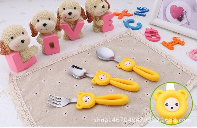 创意不锈钢儿童餐具 可爱卡通叉勺子套装 塑料手柄勺子汤匙三件套
