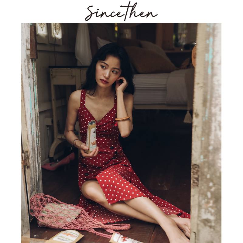 2019新款夏季文艺小清新红色波点中长款连衣裙