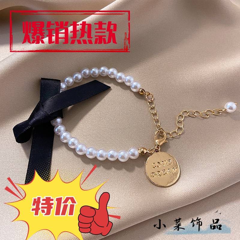 黑色蝴蝶结珍珠手链女 ins复古气质百搭字母圆片手镯