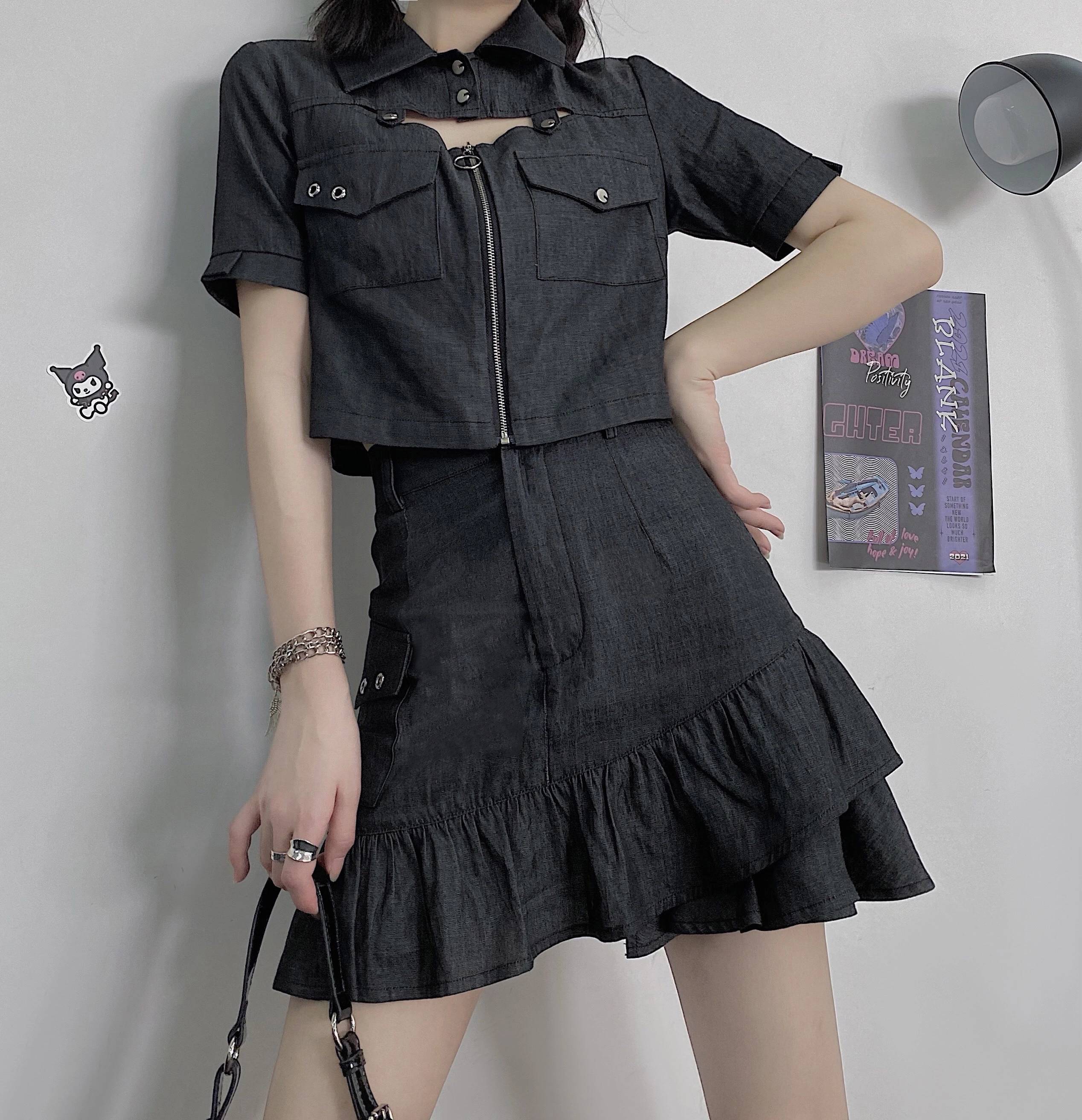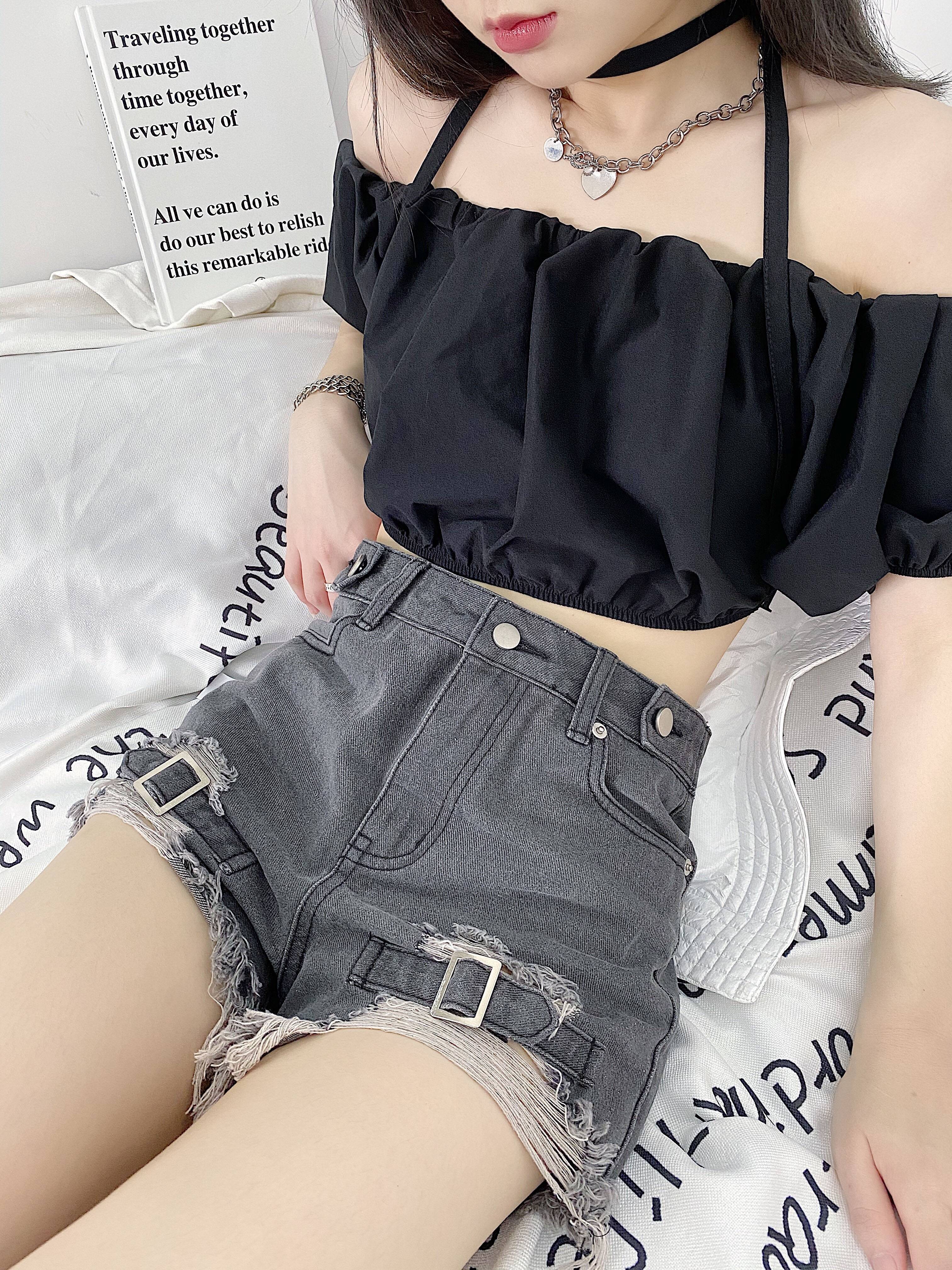 又乖又酷仿牛仔纹理美式复古感ins短衬衫夏季辣妹套装