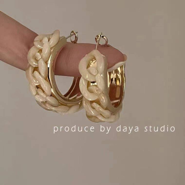 温柔的奶杏色 复古法式树脂链条圆圈耳环 精致高级感小众气质耳圈