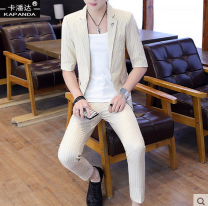 2018新款韩版修身条纹男士小西装套装休闲英伦礼服春夏西服外套潮
