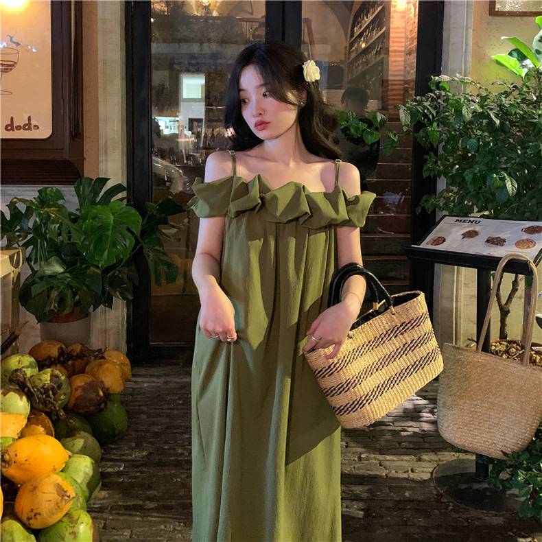 kumikumi设计感一字肩吊带连衣裙女春季新款宽松减龄A字裙长裙子