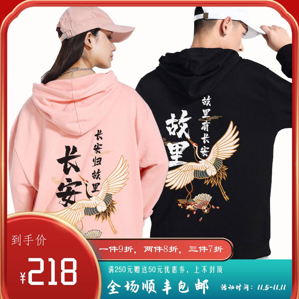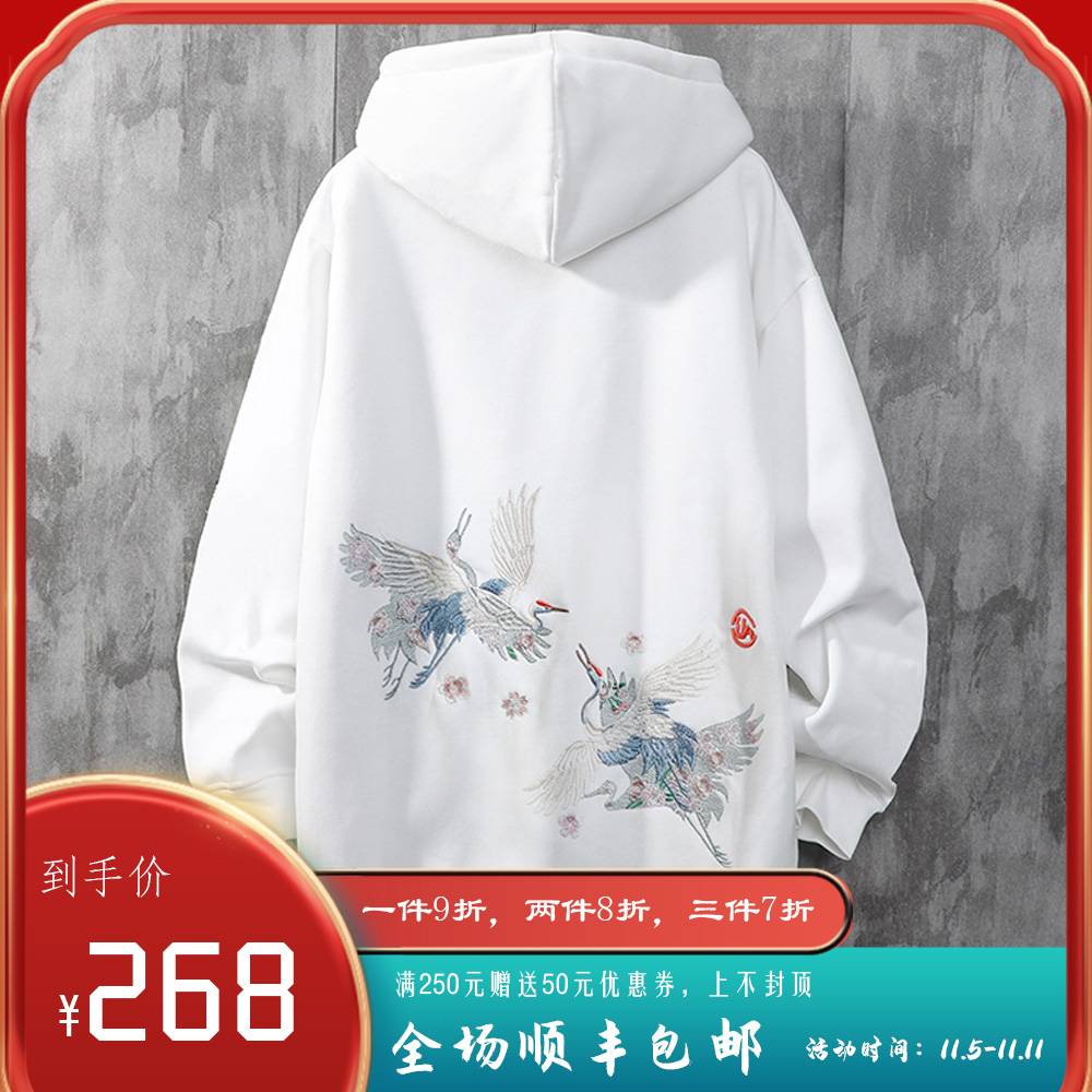 中国风复古仙鹤刺绣卫衣男宽松连帽潮流国潮情侣装百搭学生帽衫潮