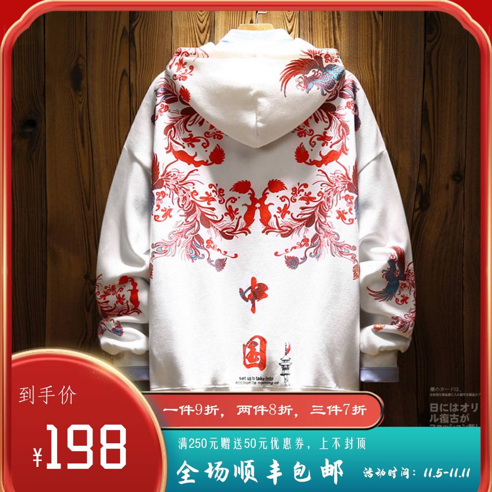 潮牌国潮中国风凤凰印花连帽卫衣 男设计感小众加绒加厚男装外套