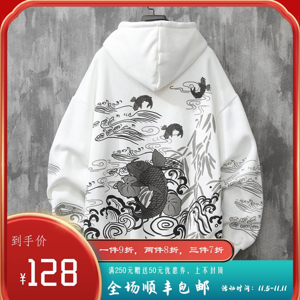 国风复古锦鲤印花加绒连帽卫衣男秋冬款宽松潮流国潮中国风男装