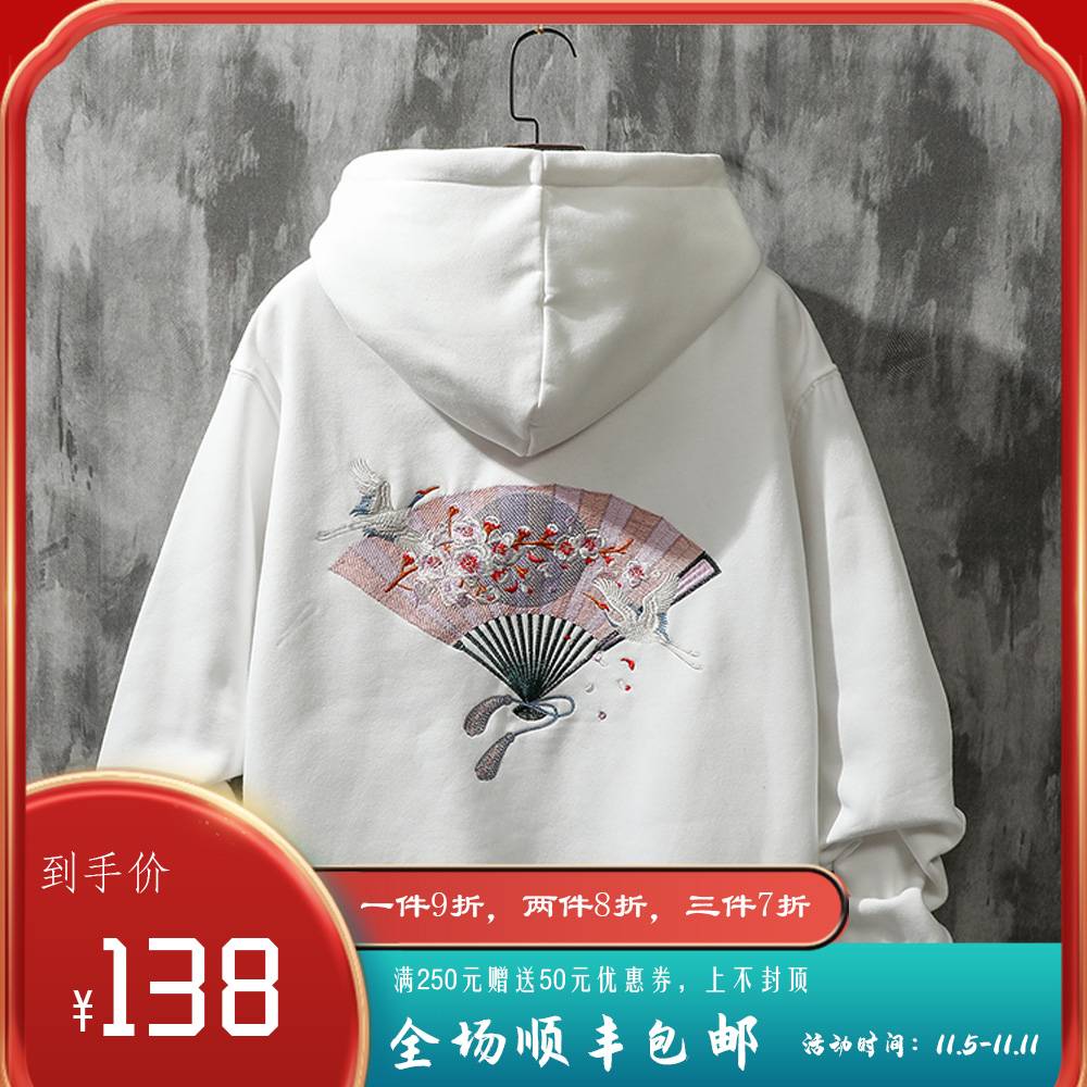 国风情侣卫衣加绒连帽秋冬款宽松国潮扇子刺绣中国风潮牌男女外套