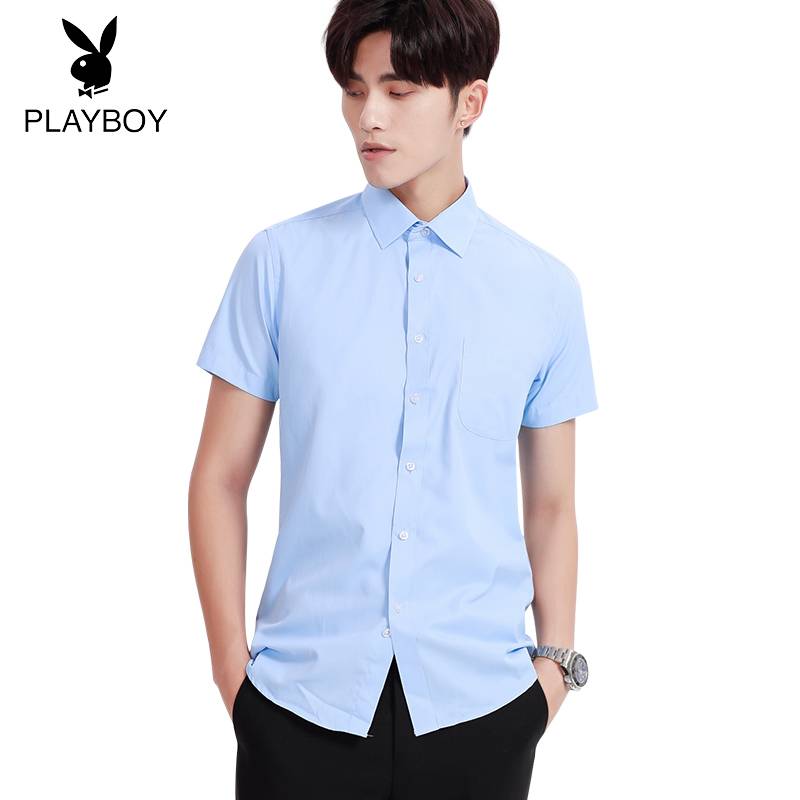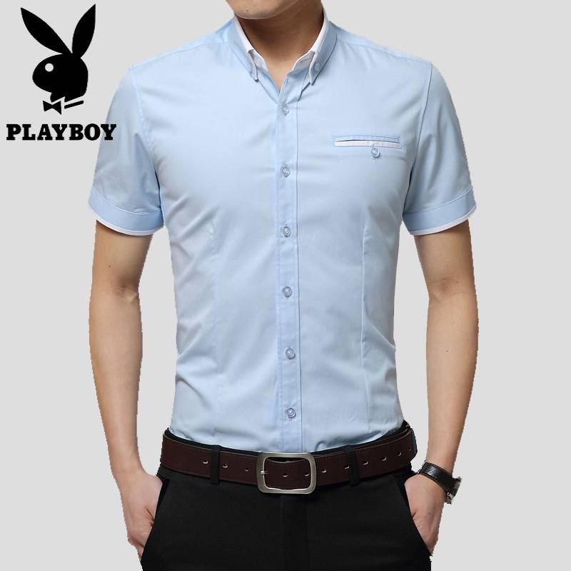 花花公子夏季男士短袖衬衫纯棉修身薄款韩版时尚休闲商务免烫衬衣