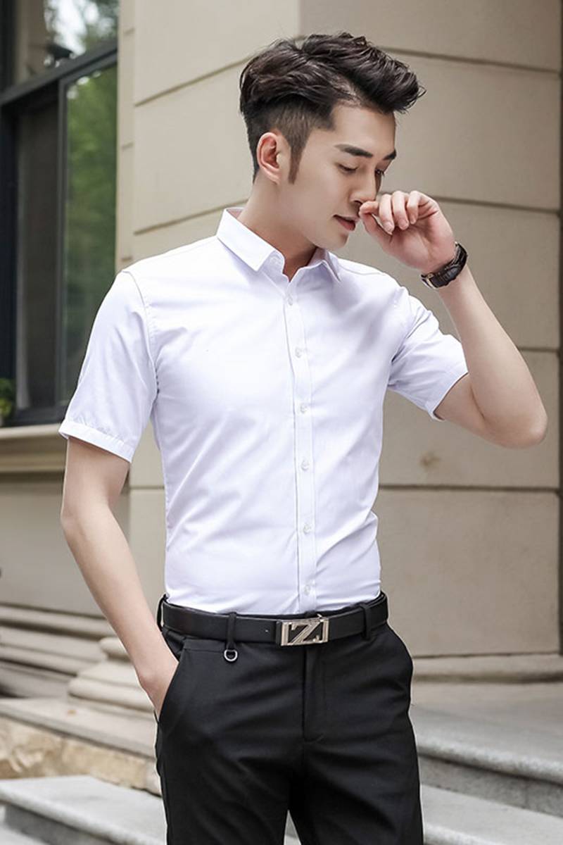 花花公子衬衫男短袖夏季薄款修身职业工装青年纯黑白色休闲衬衣潮