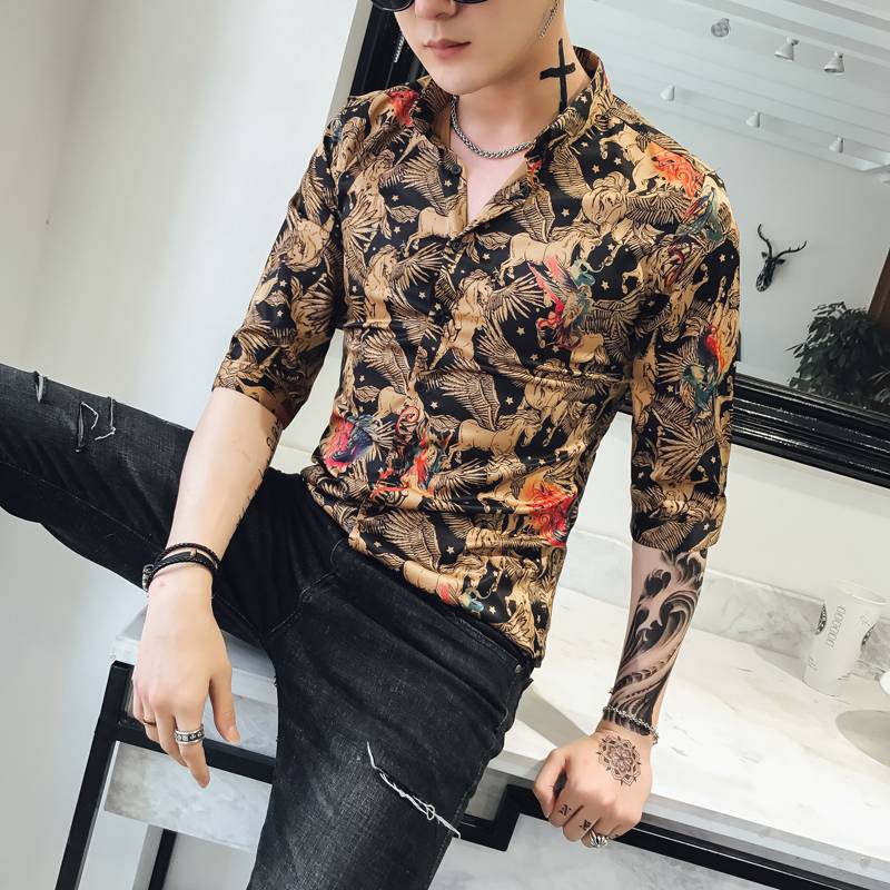2018春秋装新款潮男时尚印花七分袖衬衫韩版修身发型师帅气花衬衣