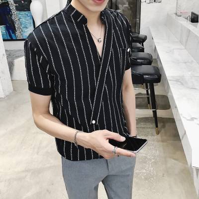 里奇先生 英伦夏季休闲发型师 立领V领衬衫男士时尚夜店短袖衬衣