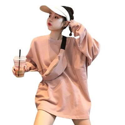 秋季女装韩版中长款纯色宽松圆领长袖休闲套头卫衣上衣外套+腰包