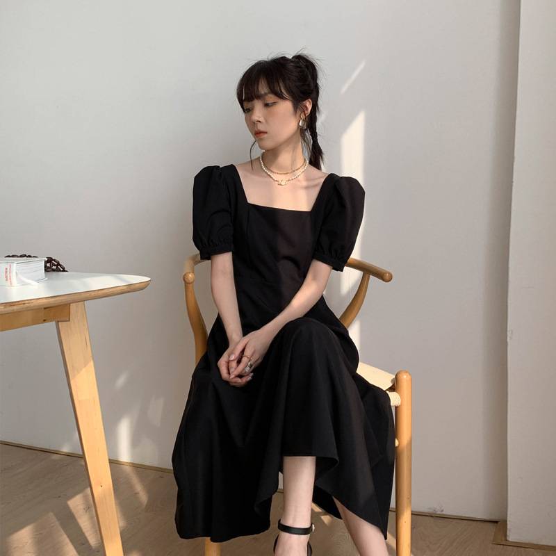 黑色连衣裙女2022夏季新款法式复古气质方领收腰长款赫本风小黑裙