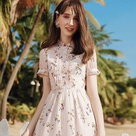 夏季新品品牌女装花瓣短袖立领A字裙印花淑女雪纺连衣裙别致独特连衣裙夏冷淡高级感气质轻奢小个子国际大牌法式百褶裙子