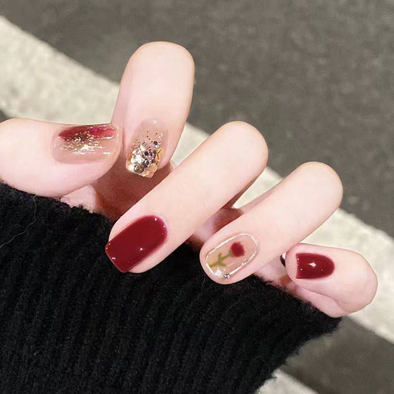 bulingbuling乌梅玫瑰穿戴甲秋冬爆闪深豆沙短款美甲贴片